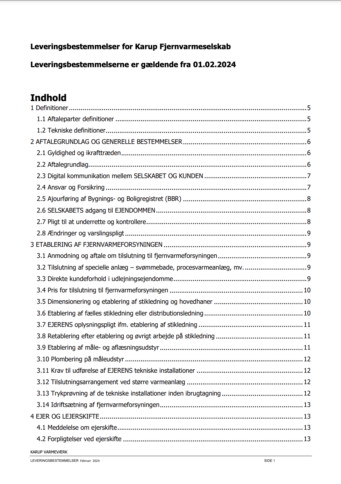 Vedtægter og diverse bestemmelser Karup Varmeværks Vedtægter april 2024 Karup Varmeværks Vedtægter og love vedtaget 23. marts 2023 Almindelige bestemmelser for fjernvarmelevering er gældende for forholdet mellem Karup Varmeværk, og ejeren af ejendomme, der er tilsluttet fjernvarmeforsyningen. Opdateret november 2023 og gældende fra februar 2024 Tekniske bestemmelser for fjernvarmelevering fra Karup Varmeværk, er gældende for projektering, udførelse og ændring af varmeinstallationer ved tilslutning til værkets ledningsnet. Gældende fra september 2017 Klagevejledning til Ankenævnet på Energiområdet. Læs her De viste dokumenter er i PDF-format og åbner i et nyt vindue når du klikker på dem
